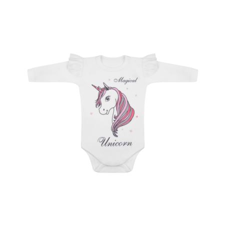 Urocze body UNICORN dla dziewczynki z długim rękawem. Ozdobione delikatnym nadrukiem jednorożca z dodatkiem pięknie mieniącego się brokatu. Marszczona falbanka biegnąca przy ramionkach jest niezywkle efektowna, uzupełni elegancką jak i codzienną stylizację małej księżniczki. Atutem kolekcji jest użycie certyfikowanej bawełny dzięki, której ubranko jest delikatne i wygodne dla maluszka oraz znosi trudy codzinnego użytkowania.