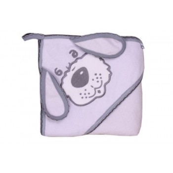 Okrycie wykonane jest z mięciutkiej i chłonnej frotki, 100 % bawełny. Obszyte jest lamówką. Z kapturkiem, który chroni główkę maluszka przed zimnem. Na kapturku znajduje się śliczny motyw pieska oraz doszyte uszka.